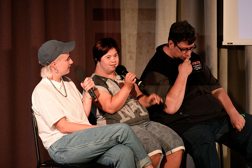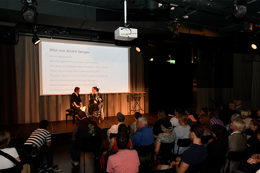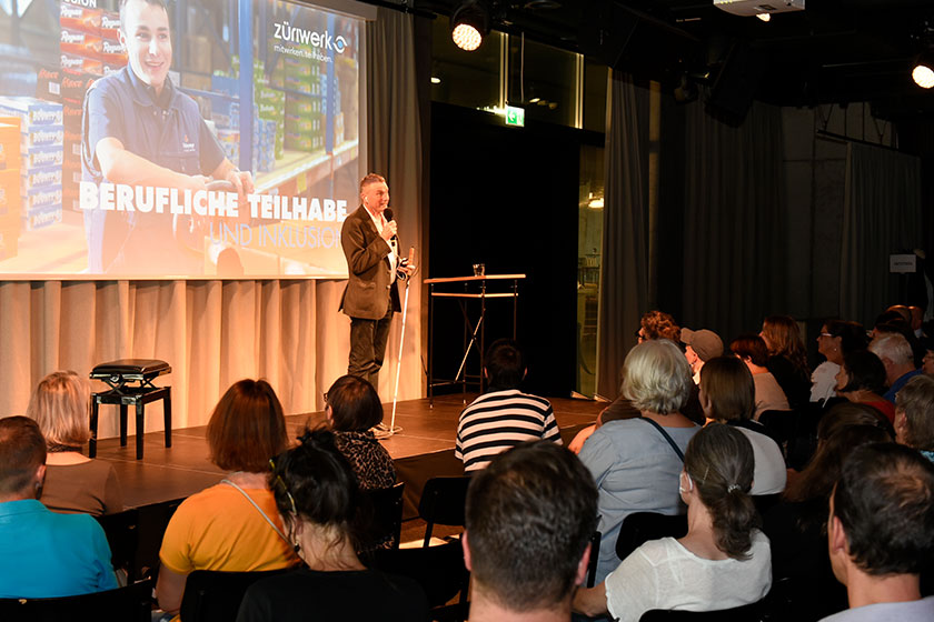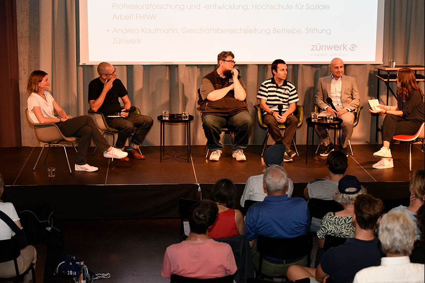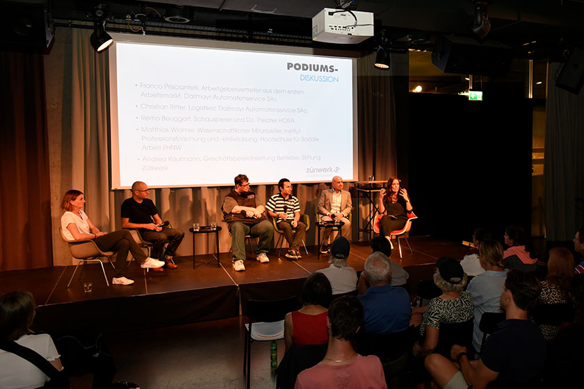 Die Gastgeberin Jenny Hofmann, Leiterin des Züriwerk-Fachbereichs Agogik, begrüsste die rund 120 Personen im KOSMOS, insbesondere die Personen auf der Bühne: Selbstvertretende, Fachpersonen, einen Arbeitgeber-Vertreter und einen Wissenschaftler der FHNW, um einen Überblick über die Thematik zu gewinnen.