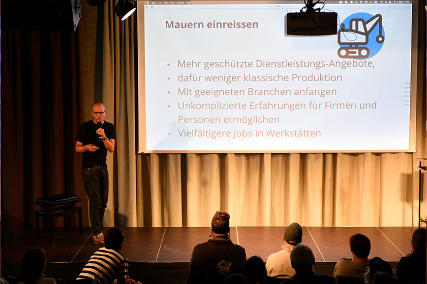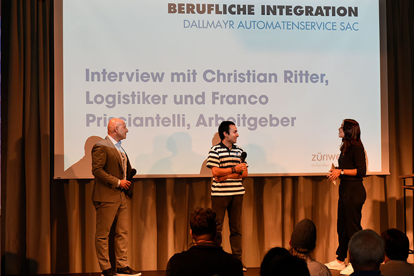 Aus Sicht eines Arbeitgebers aus dem ersten Arbeitsmarkt braucht es vor allem Entschlossenheit. Diesen Eindruck vermittelte Franco Prisciantelli, CEO der Dallmayr Automatenservice SAc. Diesen unterstrich er mit seinem abschliessenden Votum: «Es gibt immer Wege. Man muss es probieren. Man muss es machen.» Einordnende Fakten, Statistiken und Begriffsdefinitionen präsentierte Matthias Widmer, Experte für Professionsforschung und -entwicklung an der Hochschule für Soziale Arbeit FHNW.