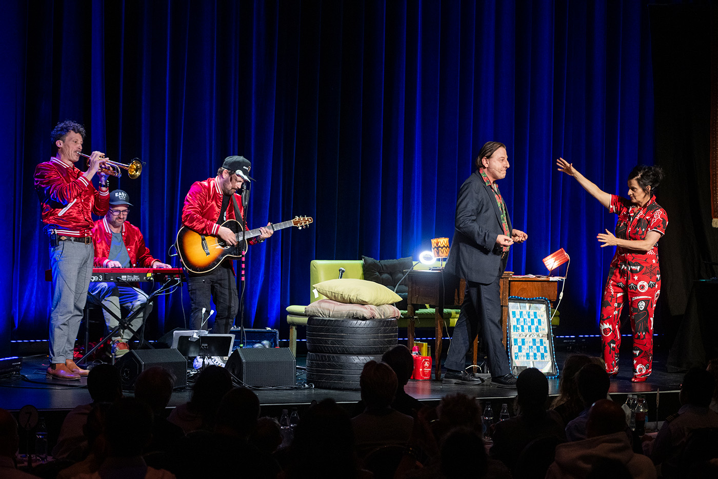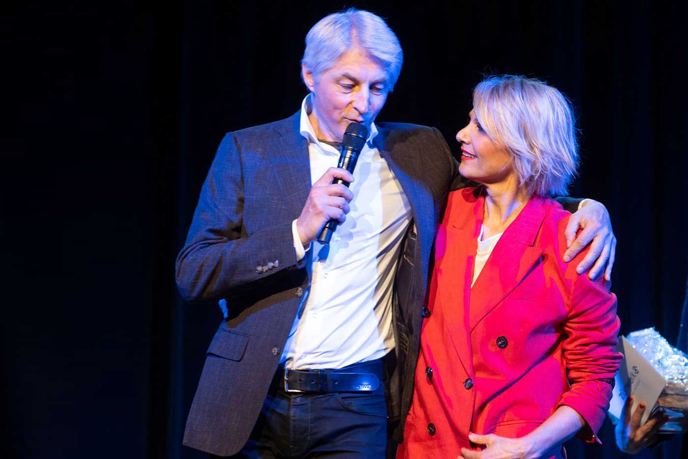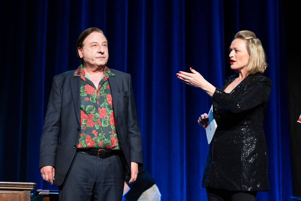 Mit gewohntem Charme, Witz und Klamauk führten Beat Schlatter und seine unverzichtbare Assistentin Anet Corti durch einen ausgelassenen Spielabend, begleitet von einer hochkarätigen Live-Band. Die Moderation übernahm die engagierte Züriwerk-Botschafterin Susanne Kunz gemeinsam mit Nikolai Gralak, Theater HORA-Schauspieler.