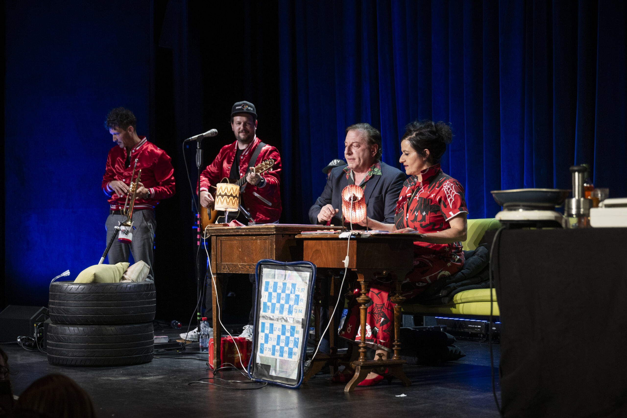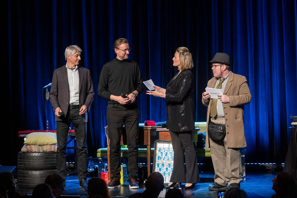 Das Bingo-Spiel war wie immer eine Wundertüte voller Überraschungen. Wer mit dem Ruf «Ich hett no gern ä Stangä!» den Mut hatte, sich als Gewinner:in zu outen, wurde mit originellen bis skurrilen Preisen belohnt. So durfte sich etwa ein Gewinner über ein persönliches Gute-Nacht-Geschichtli von Beat Schlatter in einem Zürcher Hotel freuen – zu seinem Glück zog er die attraktive Alternative zur Übernachtung in der WG von Beats Bruder an der Langstrasse. Auch eine Badezimmerausstattung samt WC-Schüssel und ein Katzenbaum wurden vergeben.