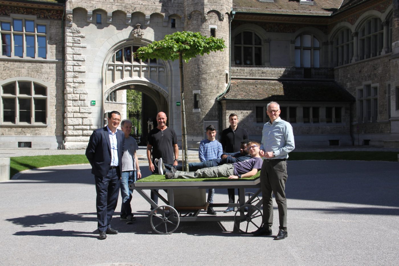 In enger und kooperativer Zusammenarbeit reiften die Handskizzen zu kleinen Kunstwerken. «Ich war beeindruckt von der Professionalität. Alle Beteiligten lieferten Qualität auf höchstem Niveau», erwähnt Luigi Razzano. Besonders gefreut hat Ihn, dass Mitarbeiterinnen und Mitarbeiter mit kognitiver Beeinträchtigung auch zu den Entwürfen und Konzepten beitrugen. «Dieser Auftrag ermöglichte uns eine sehr hohe Mitarbeiterbeteiligung», ergänzt Marcel Blanchet, Leiter der Züriwerk Produktion Baslerstrasse, erfreut. Knapp zwei Monate nach der Auftragserteilung stehen die attraktiven rollenden Rasenteppiche nun im Innenhof des Landesmuseum. Andreas Spillmann ist begeistert: «Gute Arbeit, das habt Ihr wirklich hervorragend gemacht!», bedankte sich der Museumsdirektor anlässlich der Lieferung bei den Züriwerk-Mitarbeitenden.