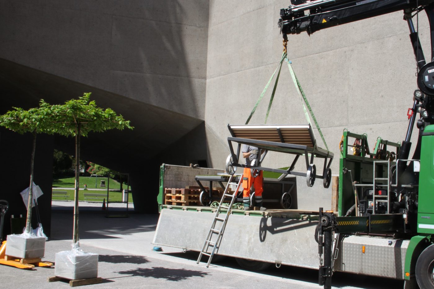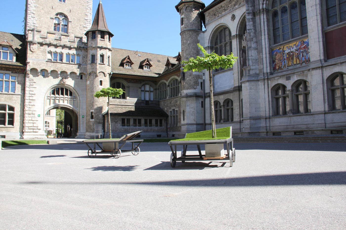 Mitte Mai lieferte das Züriwerk-Team Rasenliegen in den Innenhof des Landesmuseums. Dort laden die attraktiven Liegemöbel ab sofort die Besucherinnen und Besucher zum Verweilen ein.