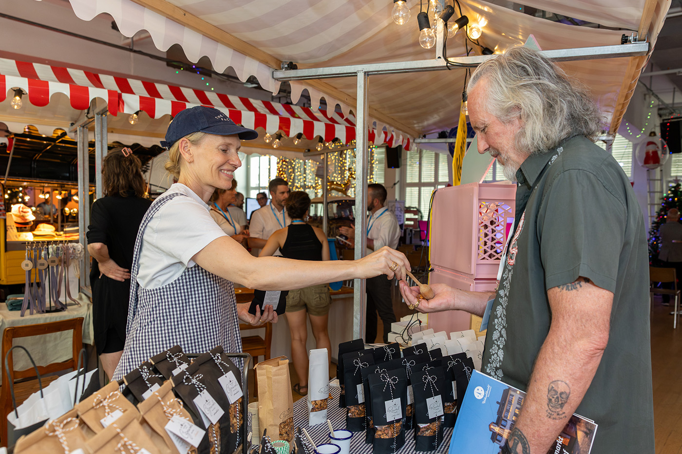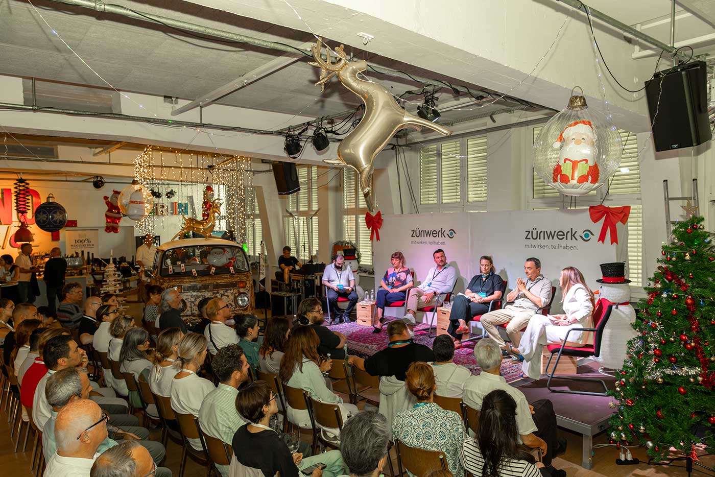 Rund 260 Teilnehmende versammelten sich im Citizen Space Kiez in Zürich-Altstetten – und traten den Beweis an: Schenken und geniessen, das geht auch nachhaltig. Und tatsächlich: Von aus fair gehandeltem Kakao hergestellter Schokolade bis hin zu lokal und inklusiv produzierten Textilien zeigten 14 Ausstellende an liebevoll hergerichteten Ständen, dass Nachhaltigkeit die Innovationskraft beflügelt. Weitere Ideen wurden an diesem Abend bestimmt geboren, denn der Austausch war rege und inspiriert.