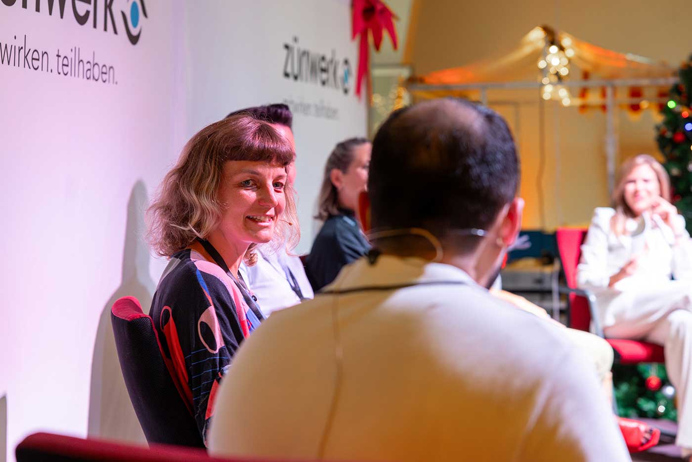 Das bewährte Moderationsduo Sarah Andrina Schütz und Luca Sukur leitete den Business Talk und fühlte den Teilnehmenden auf den Zahn: Wie halten Sie’s mit der sozialen Nachhaltigkeit? Dabei zeigte sich, dass das Bewusstsein für Inklusion in den Unternehmen und der Politik stetig wächst – aber auch, dass es noch einen weiten Weg zu gehen gilt.