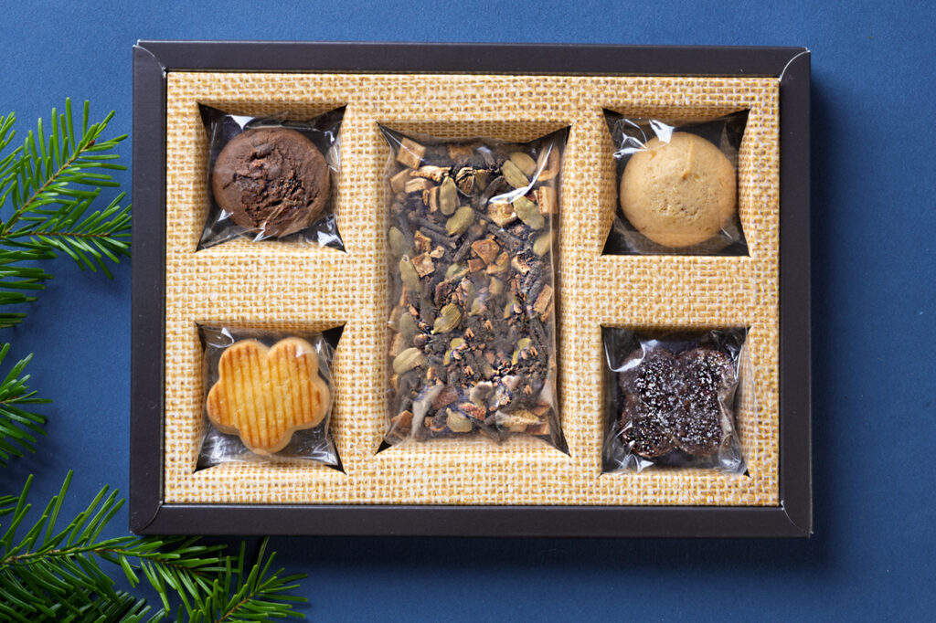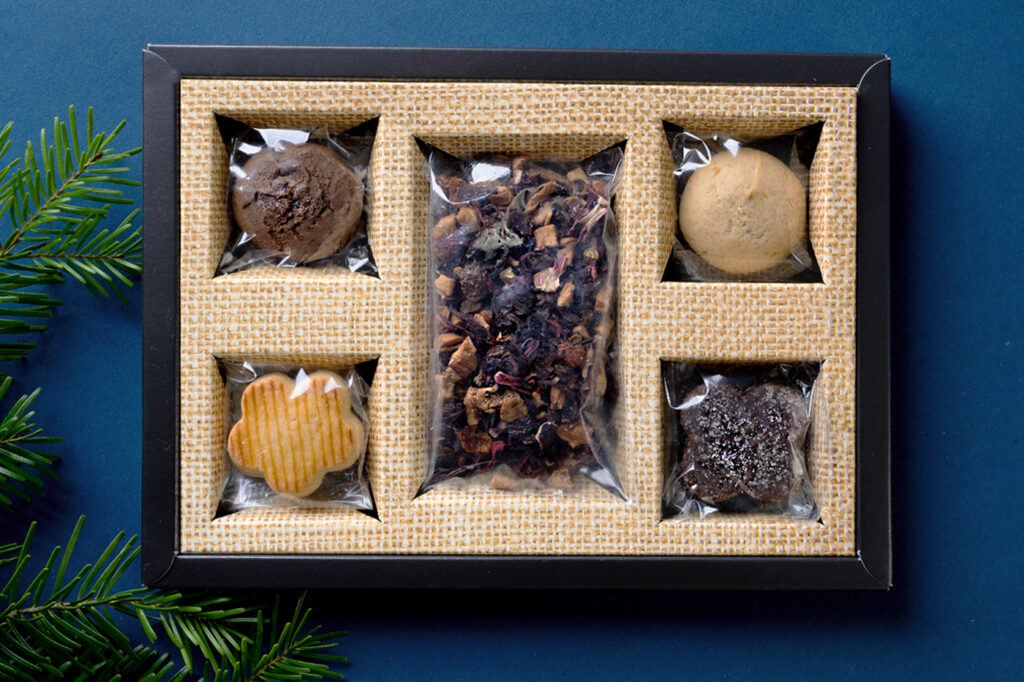 - Gefüllt mit 4 verschiedenen Guetzli und je nach Wahl einem Lebkuchen, einer Glühwein-Mischung oder einer Wintertee-Mischung