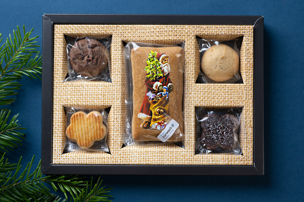 Für Ihren Weihnachtsversand «PLUS»: Eine postfertige A5-Karte, gefüllt mit feinem Gebäck aus der Züriwerk-Bäckerei.
